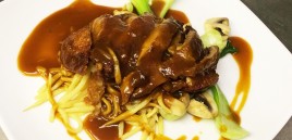 Sprøstekt andefilet serveres m/ hoisinsaus og grønnsaker