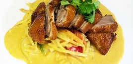 Sprøstekt andefilet m/ rød karri, kokosmelk og grønnsaker