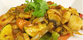 Bi,kylling og scampi i Husets chilisaus